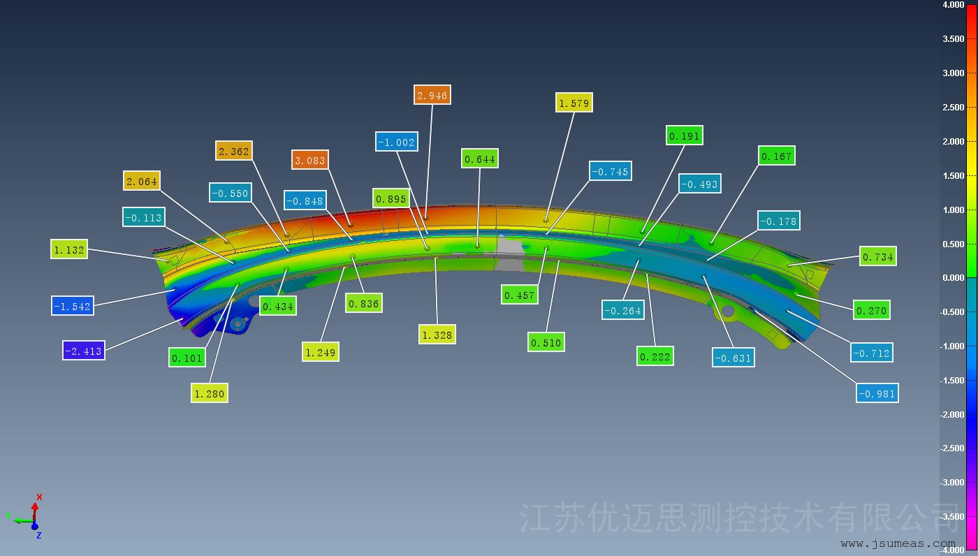 报告导出导出的报告内容如图2,检测数据与参考曲面的误差通过颜色直观显示趋势,抓取的点数据偏差直观、明了。在此次的应用中,充分展示了多种测量方式的重要性。