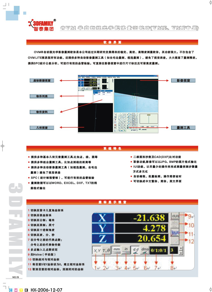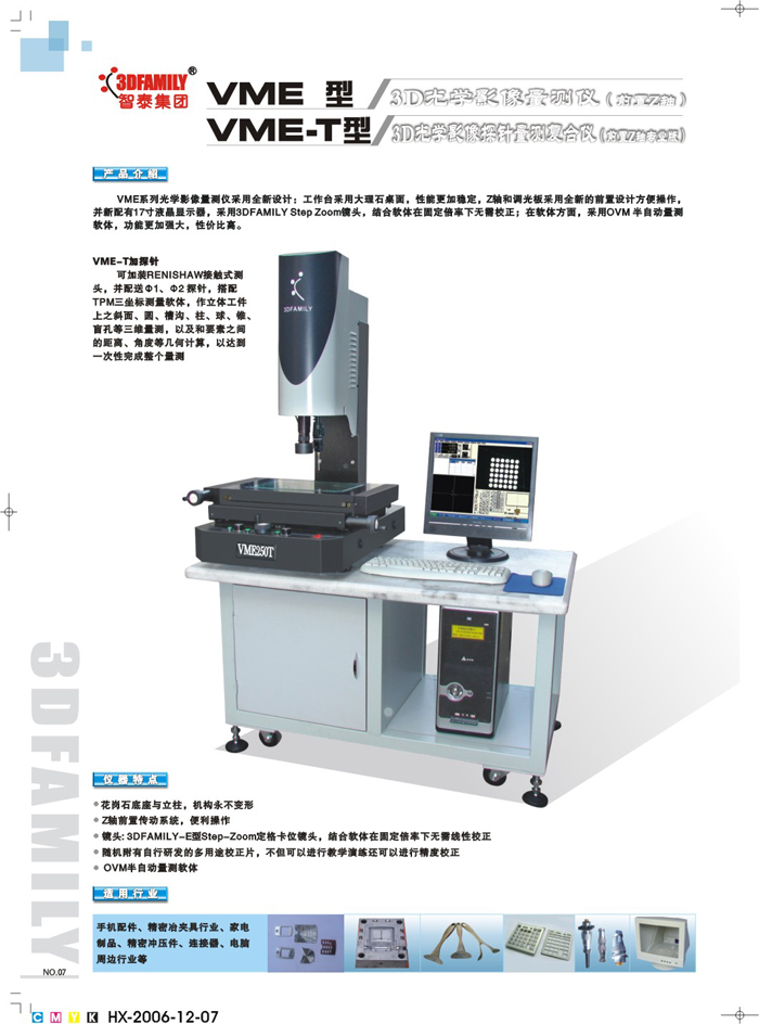 详细信息| 询价留言品牌:3DFAMILY智泰 型号:VME250 VME300 加工定制:是 操作方式:程序 分辨率:0.001 mm 测量行程:300*200 放大倍率:28-180X 测量精度:(3+L/200)um 外形尺寸:640*730*800 mm Price仅作标识用,如需确切价格,请与销售联系确认! 3DFAMILY智泰二次元影像测量仪 VME250 VME300 产品介绍3DFAMILY智泰二次元影像测量仪 VME250 VME300 产品参数表 -